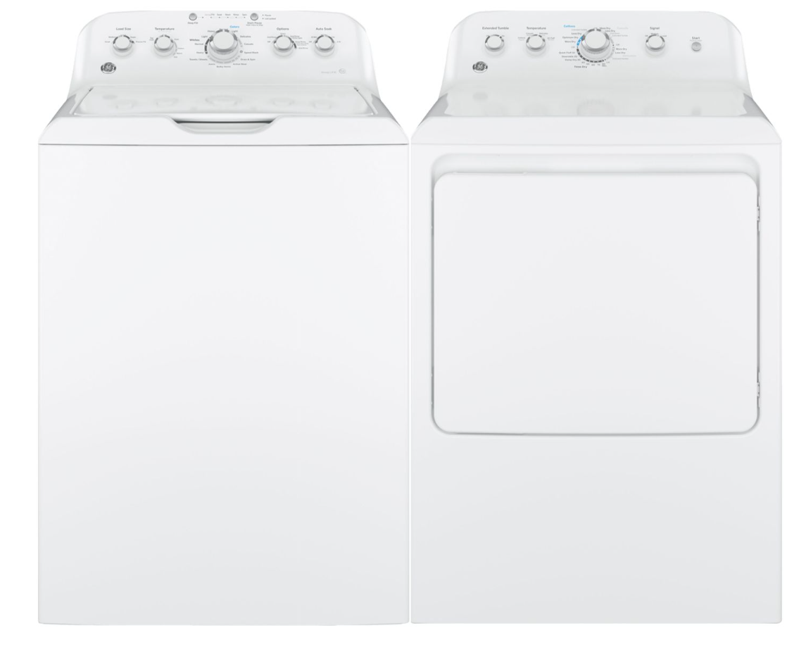 GE® White Laundry Pair with a 4.5 cu. ft. capacity top load washer and a 7.2 cu. ft. capacity front load electric dryer.Read More